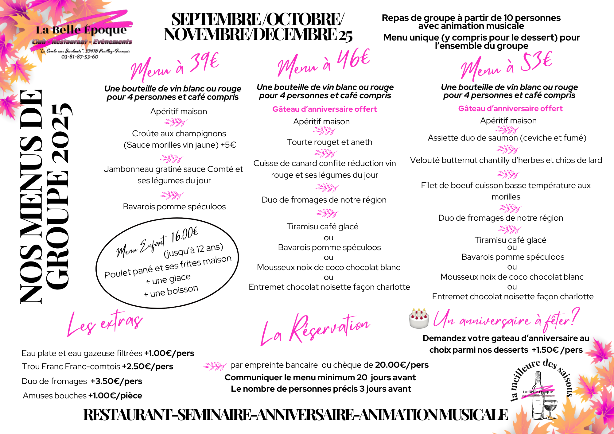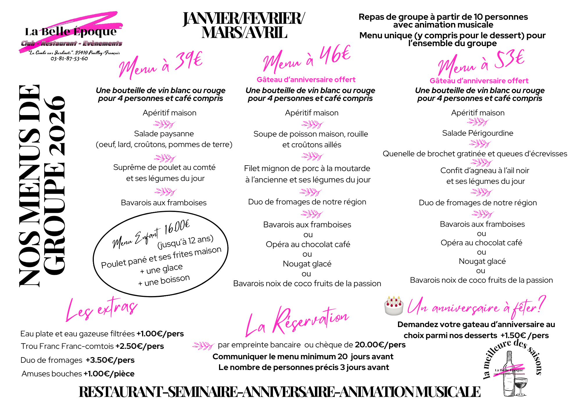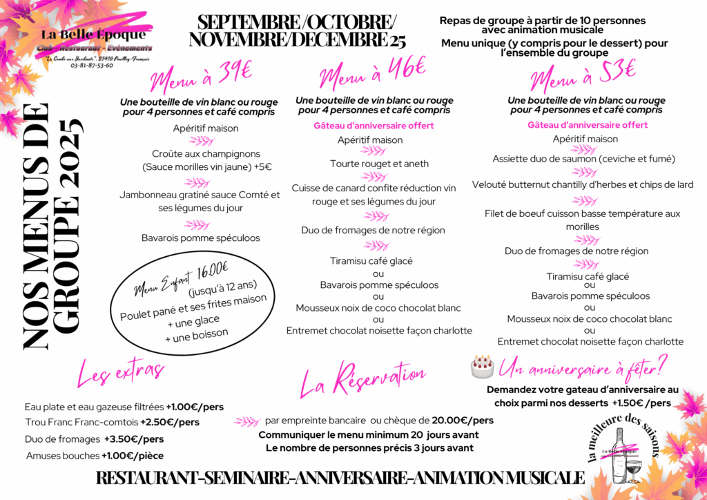 La dernière formule conviendra parfaitement à vos évènements de groupe. Que ce soit pour une soirée d’anniversaire, un repas d’entreprise, un mariage, un menu de groupe, nous saurons satisfaire vos attentes. (Découvrez également nos événements !)