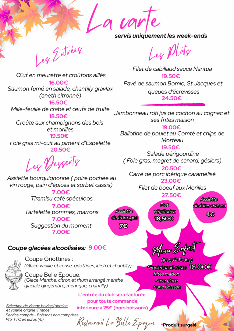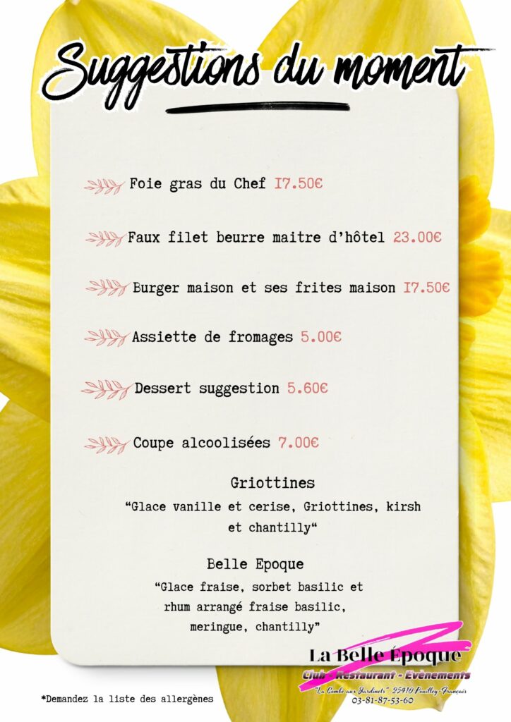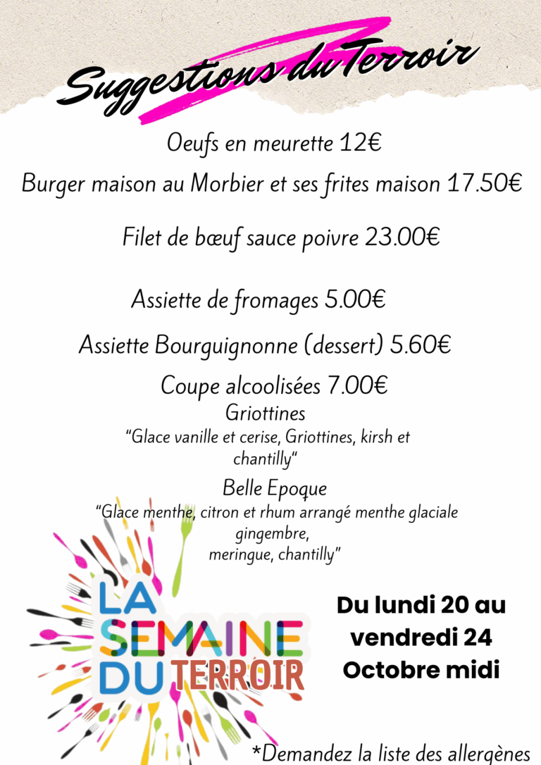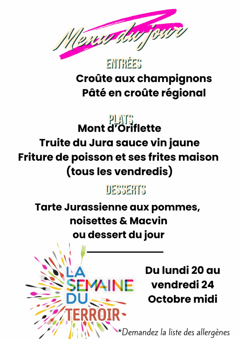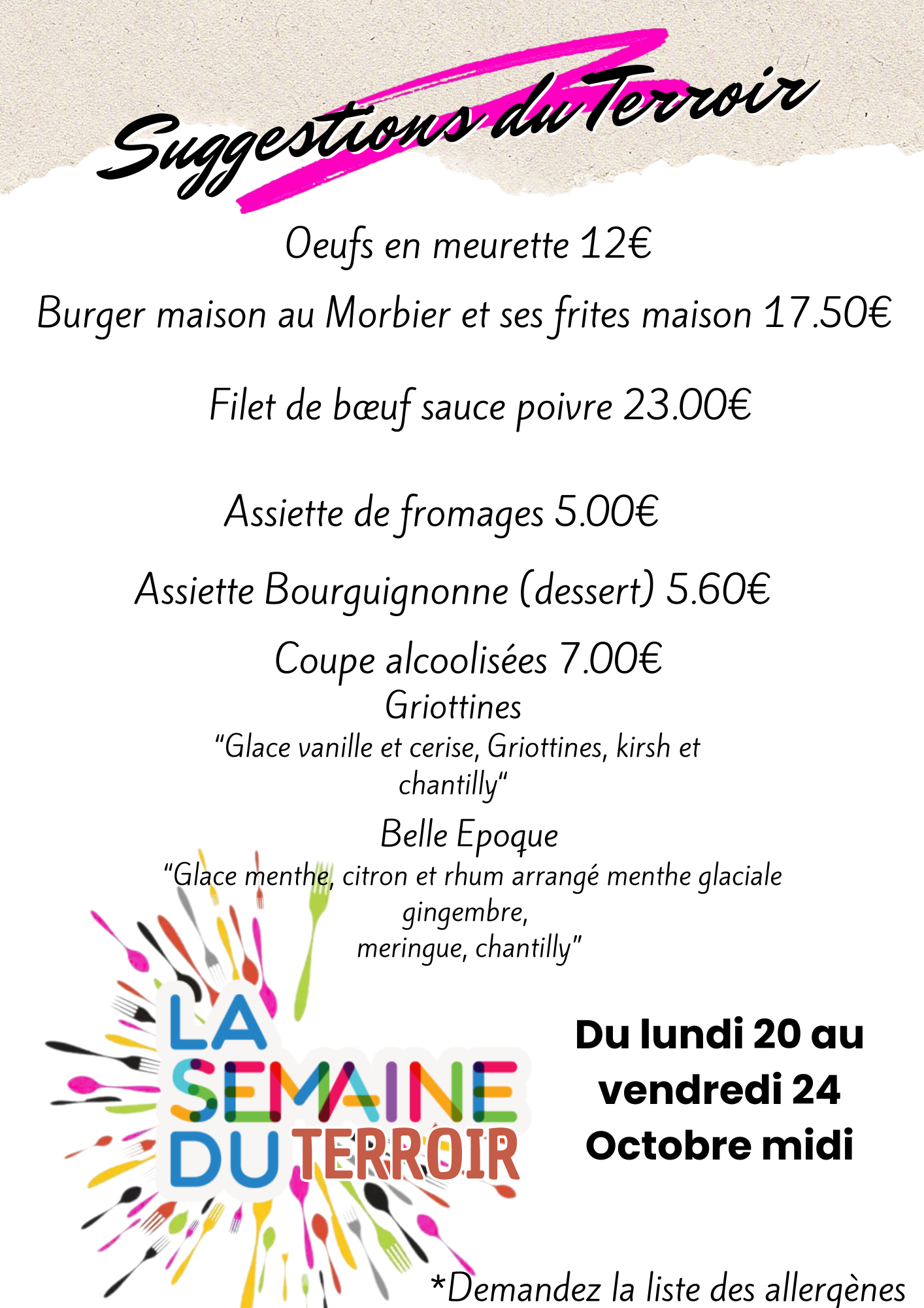 La semaine, le chef vous propose une formule du jour avec des plats frais et de saison. Retrouvez les spécialités incontournables de notre établissement, sans oublier notre traditionnel buffet d’entrée. Nos menus du jour sont disponibles et renouvelés chaque dimanche soir sur notre page Facebook.
